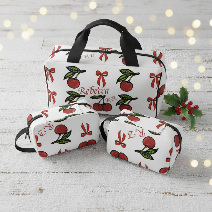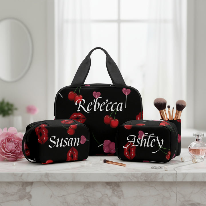 Make up Bag, Personalized Set, 3-Piece Cherry Lips Makeup Organizer, Travel Gift for Her