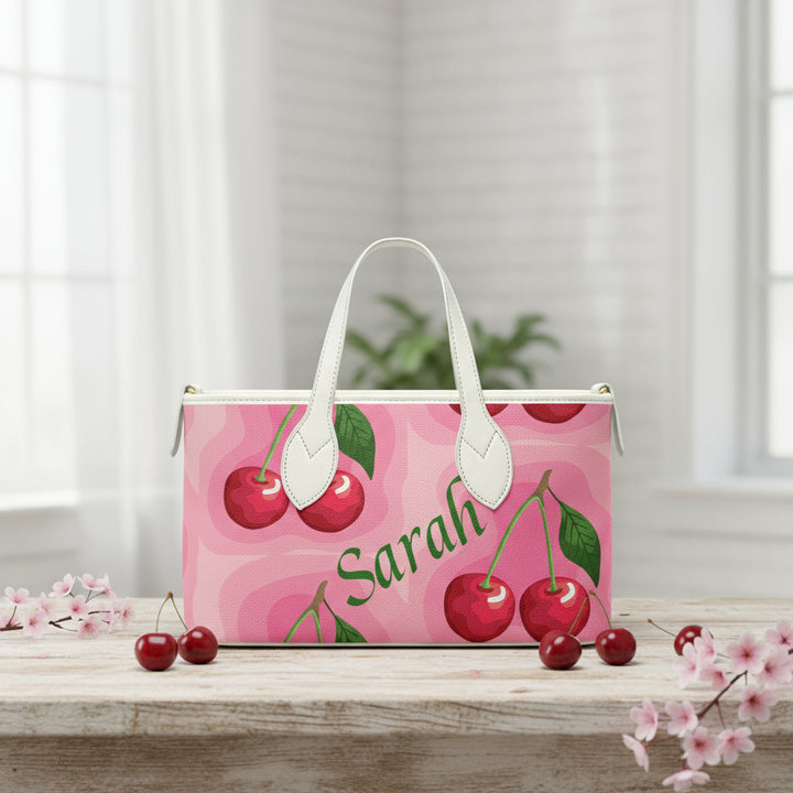 Mini Tote Bag, Leather Small Personalized Shoulder PU Leather Handbag in a Pink Cherry Print