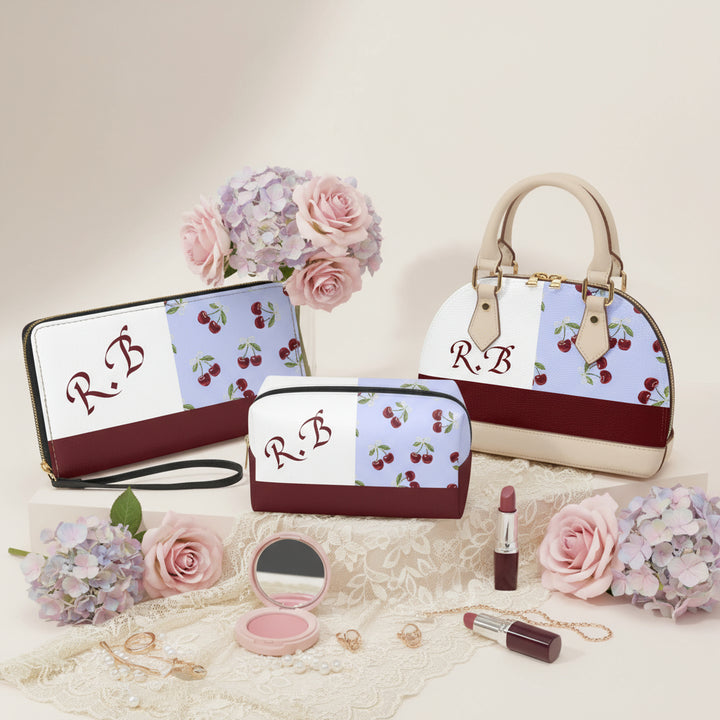 Custom Makeup Bag Set, 3-Piece Toiletry Organizer, Cosmetic Bags, PU Leather Personalized Pink Cherry
