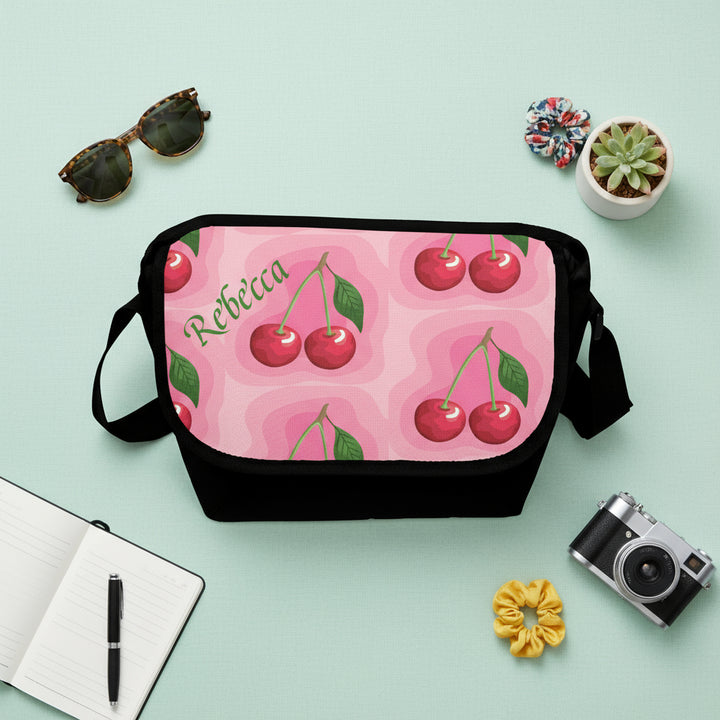 Canvas Messenger Bag, Custom Pink Cherry Green Print Crossbody, Personalized Shoulder Handbag, Large Purse